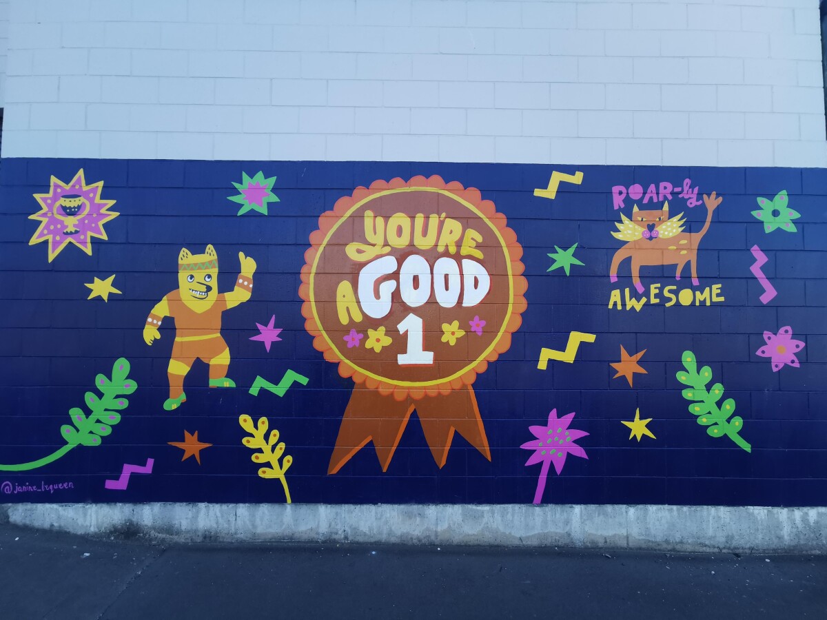 "You're a Good One" by Janine Wareham on the wall outside 417 Selwyn Street near the corner with Harman Street. Painted as part of the Good in the Hood national campaign sponsored by Z Energy, promoting positive change in urban communities. Janine was commissioned to paint murals in Christchurch, Wellington and Auckland as part of this campaign.