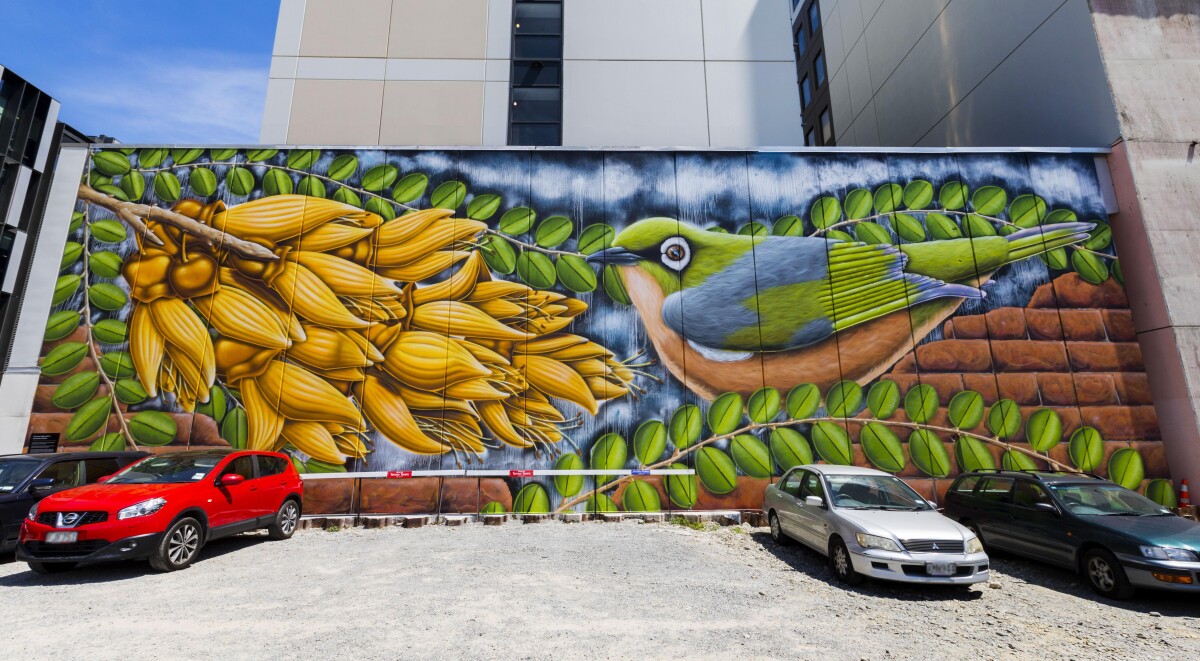 "Rise From the Rubble" by Brandon Warrell, winner of the Christchurch City Council Enliven Mural competition. Located on the east side of the Ibis Hotel at 107 Hereford Street in the central city.
