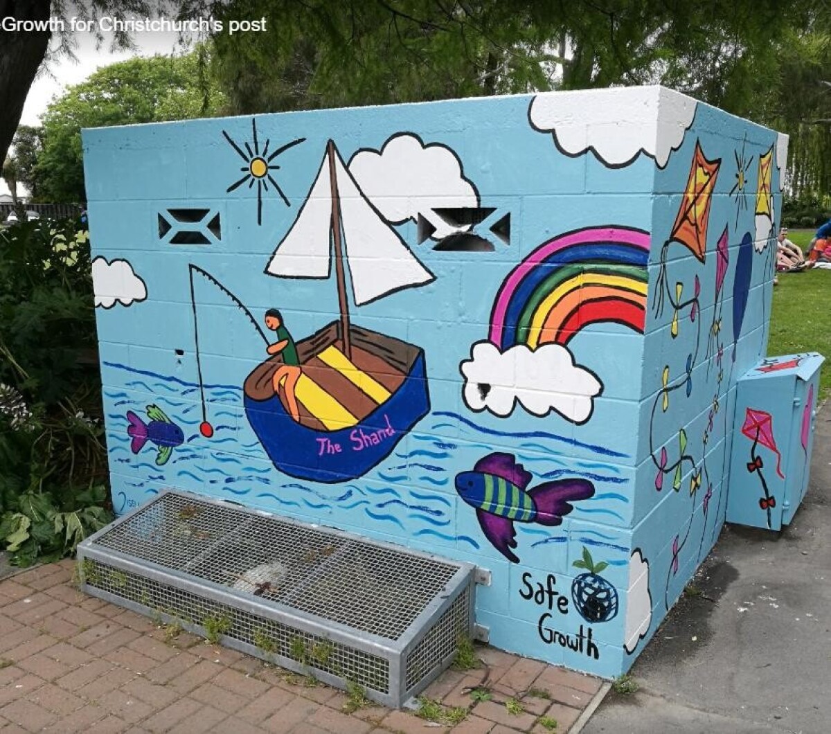 Mural created by the Riccarton SafeGrowth Neighbourhood Facilitator Team with support from Christchurch City Council. Located on the fountain pump house at Shand Crescent Reserve in Riccarton. From the Riccarton SafeGrowth Neighbourhood Facilitator Team: "The Riccarton SafeGrowth Neighbourhood Facilitator Team delivered a wonderful event to activate and engage their neighbourhood on Saturday 11 November. The fountain pump house in Shand Crescent Reserve was a drab structure that attracted graffiti. The Team gathered mural ideas from residents on the theme of "happiness" and our wonderful artist Liselle Atlas Silver themed the ideas into the final mural. Neighbours and passers by stopped by throughout the day to paint, have a coffee and some BBQ and salad, or just to listen to the excellent music by Yellow. Thanks to Samuel and the CHCH101 team who partnered with us; Richard of City Care, who gave us access to toilets and helped in many other ways; Kelly-Anne of Elsies Coffee Stop, who kept us supplied with excellent hot drinks; and Christchurch City Council, for allowing us to paint the pump house. A very special and huge thank you goes to New Zealand Red Cross, who funded the SafeGrowth Neighbourhood Facilitator Training and have made our work possible. But most of all, thanks to the Riccarton SafeGrowth Team and the many people who took part - you're all legends!