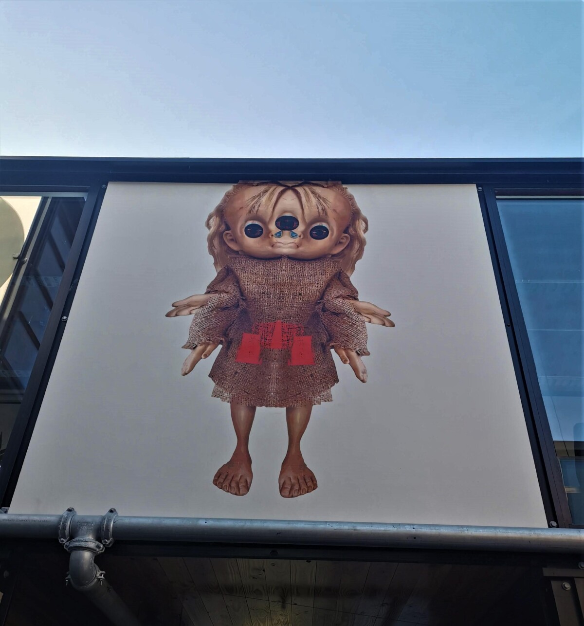 A paste up titled "Freaky Ascending Angel" by Mark Catley, a rehash of another paste up by the same artist titled Poor Girl. Located above ground level at the Boxed Quarter on the corner of Madras Street and St Asaph Street in the central city.