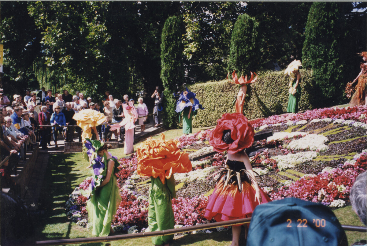 Floral clock in Victoria Square with people dressed as flowers, part of flower festival.