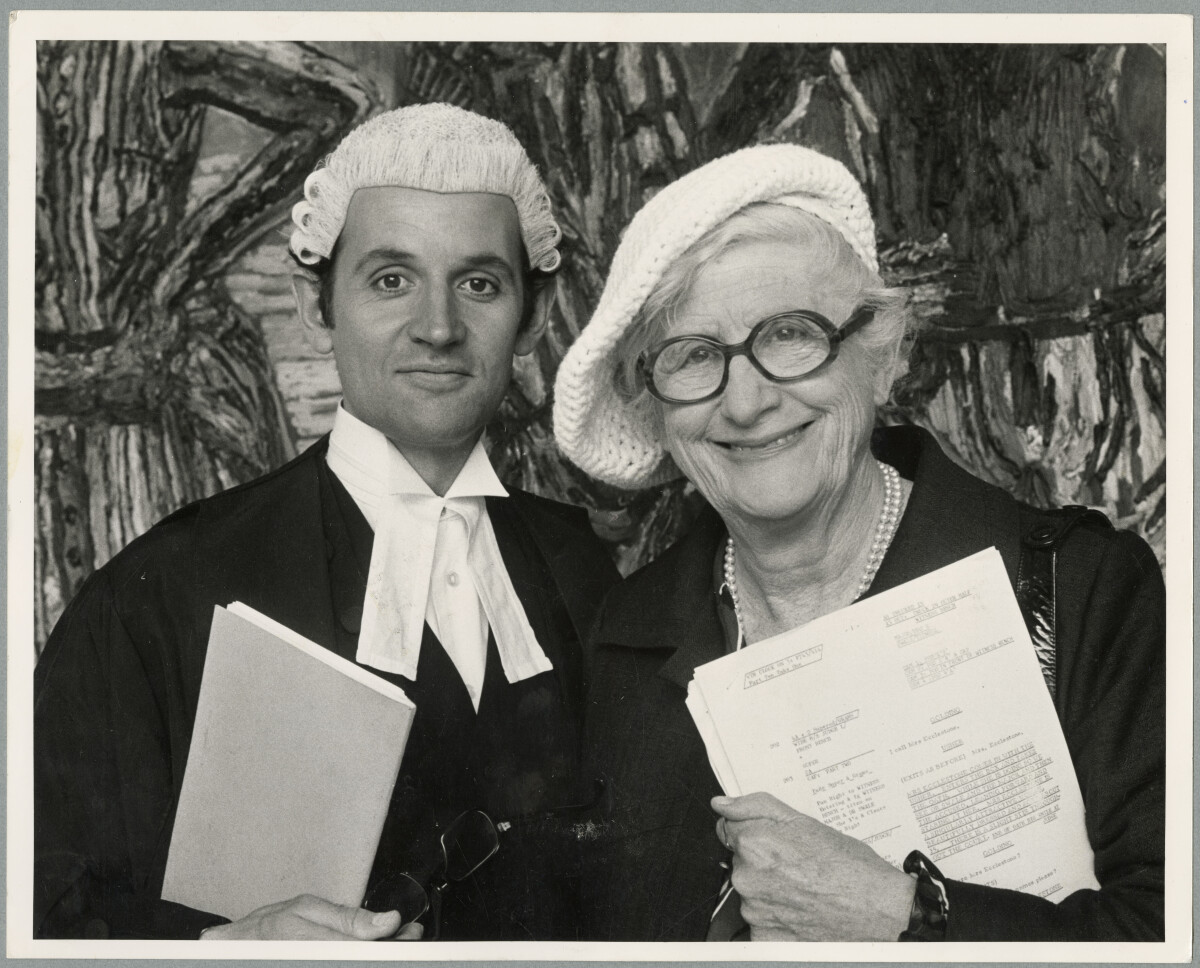 Ngaio Marsh holding a script for a 'Crown Court' play for British television, standing with actor Jonathan Elsom in costume.