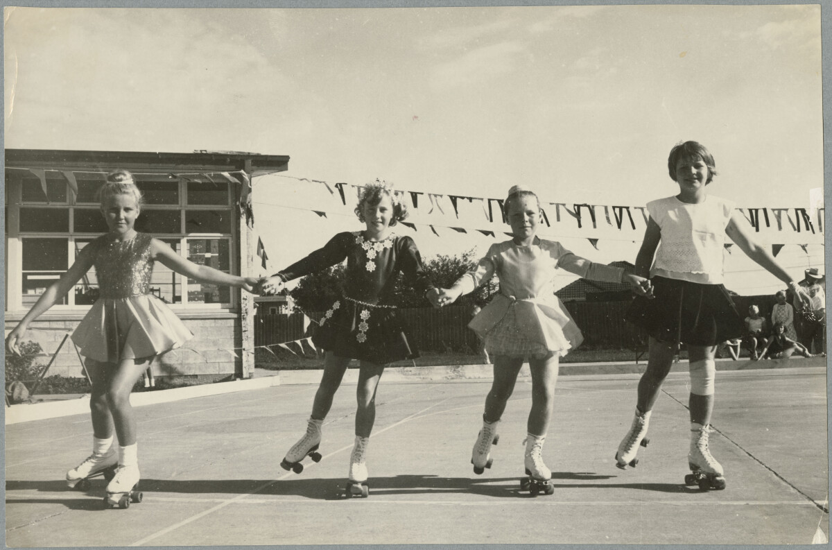 Christian Ward, Shirley Charles, Carol Hood, and Lorelle Baxter roller skating at Sockburn School during the Easter pennant competition.