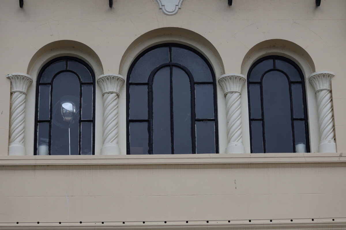 Shows close up details of barley columns on a shop frontage in New Regent Street. This architectural feature is used in Spanish Modern architecture.
