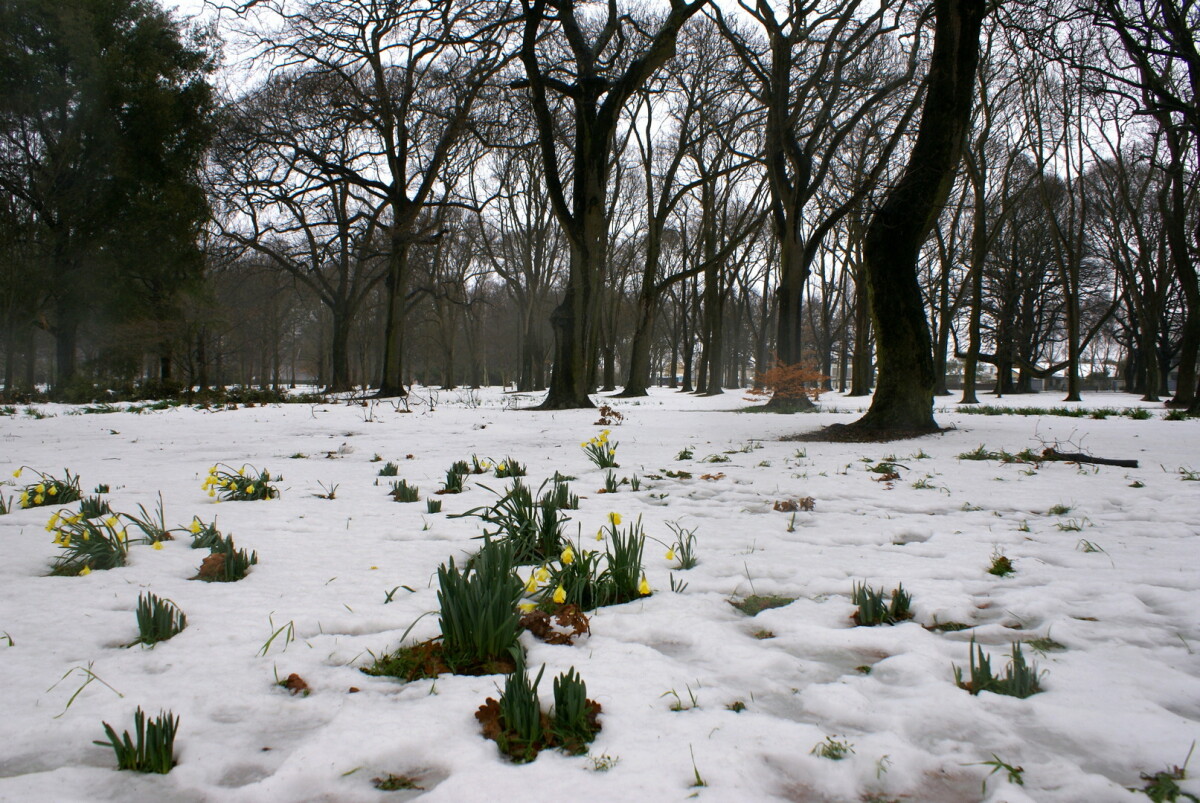 Early daffodils after a August snow fall in South Hagley park.