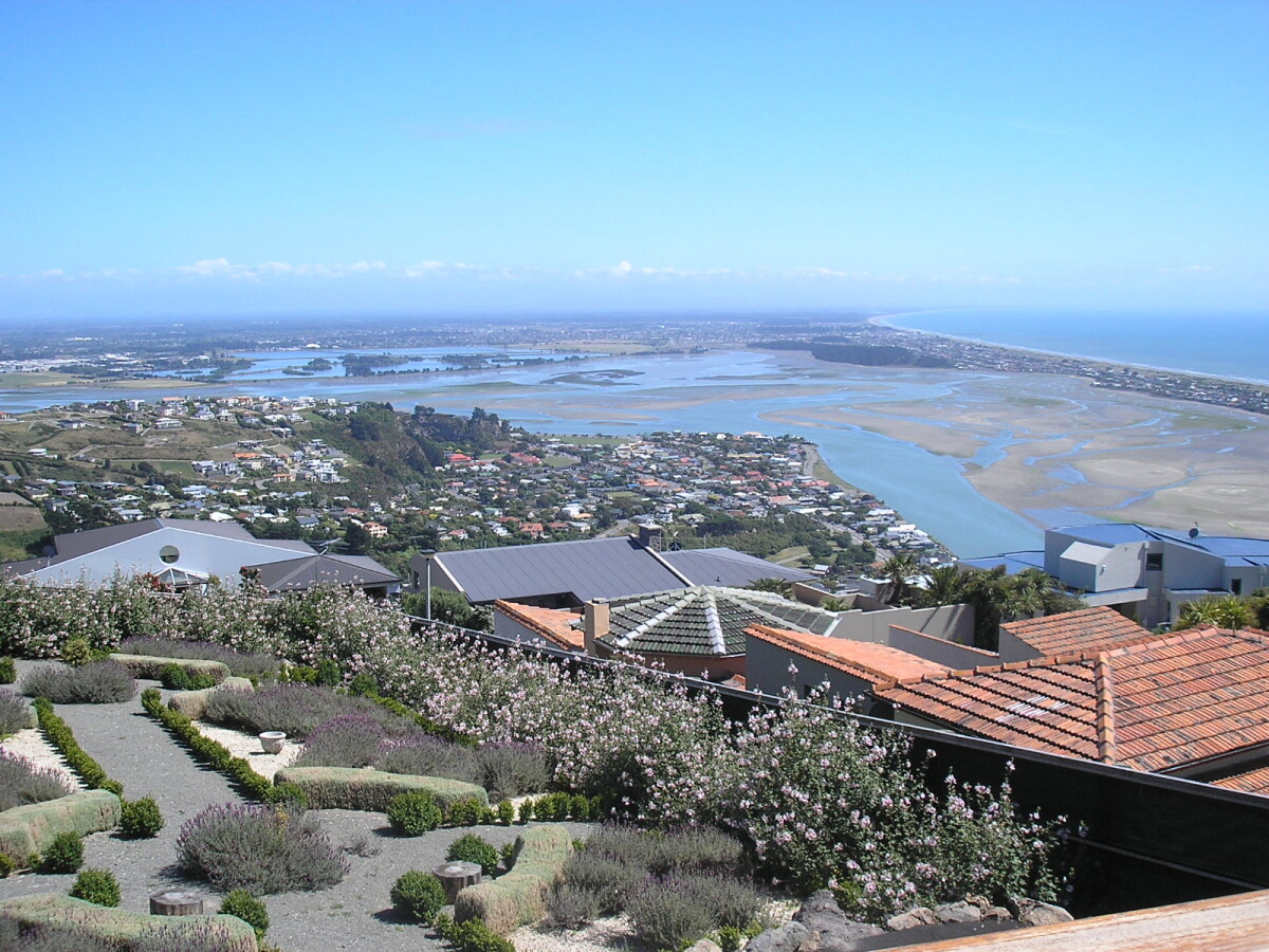 View out over Pegasus Bay and Christchurch from the prow of the Ark.