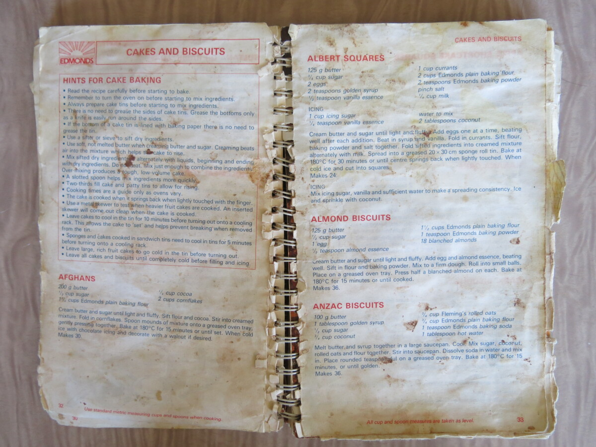 A well used cookbook. Open to the page for Afghans, Albert Squares, Almond Biscuits and Anzac Biscuits.
