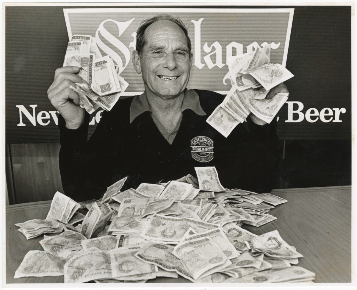 Alfred Stokes of Avonhead holding up some of his $25,000 winnings from the New Zealand Breweries barcode bankroll competition. The winner was drawn from barcodes sent in from the back of Canterbury Draught beer.