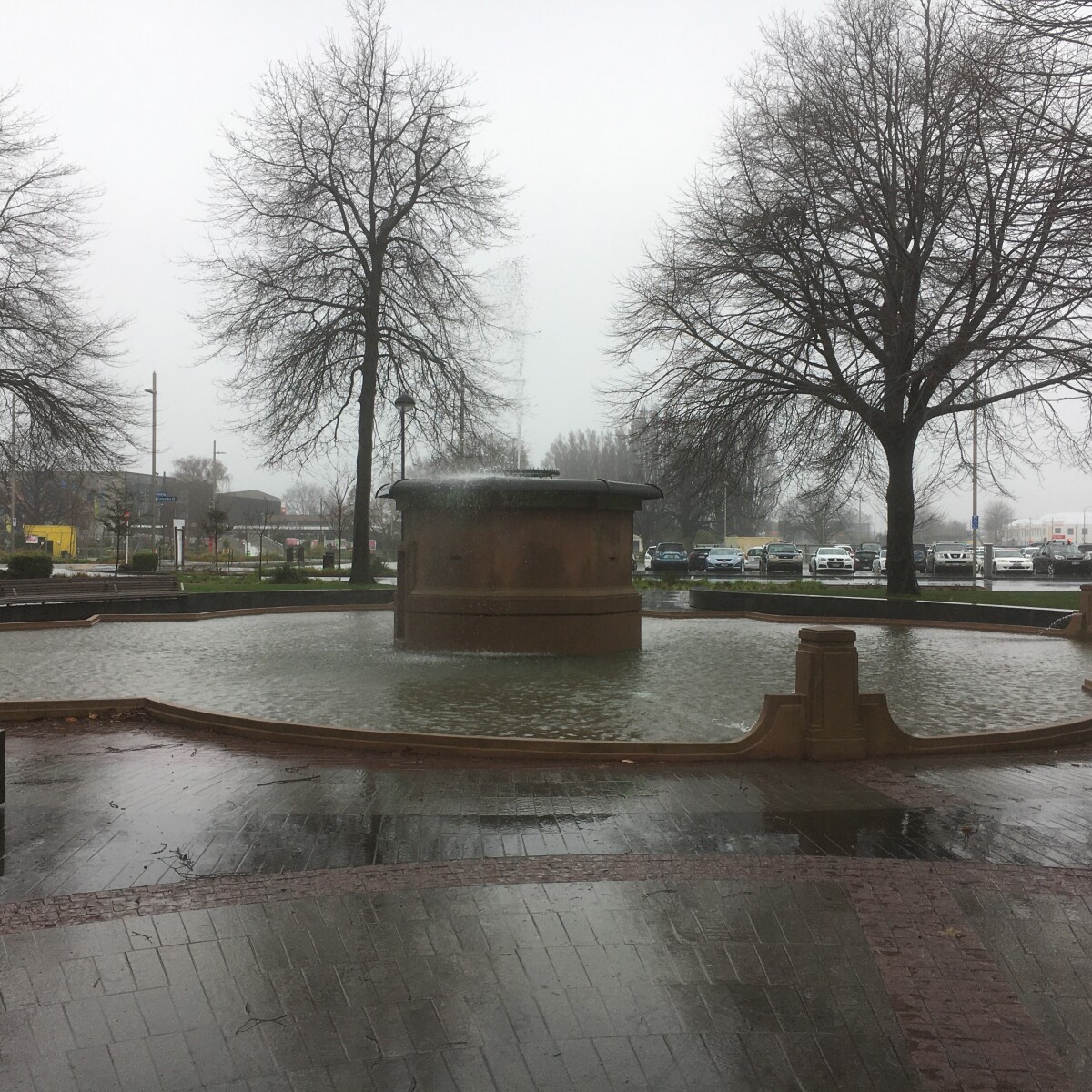 Shows the Bowker Fountain, Victoria Square after a period of heavy rain.