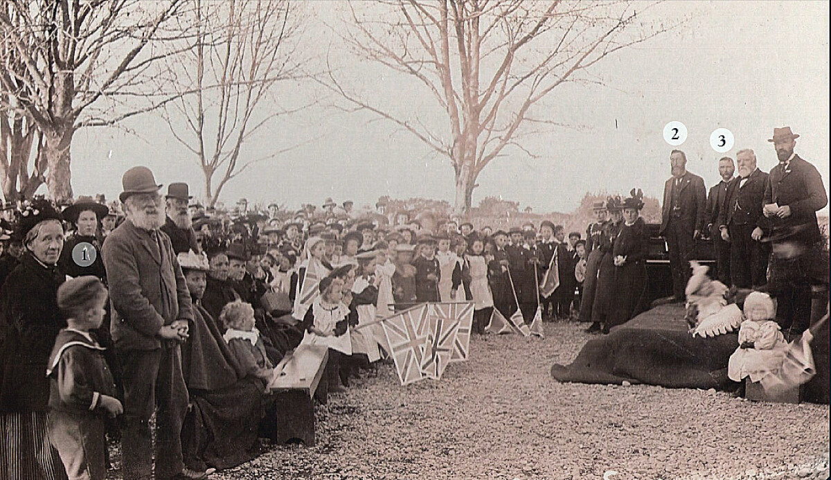 Flag hoisting ceremony 25 July, 1900 at Harewood School. 1/Edith Hockey (nee Stanley) 2/Mr Twose (Headmaster) & 3/Mr Charles Stanley.