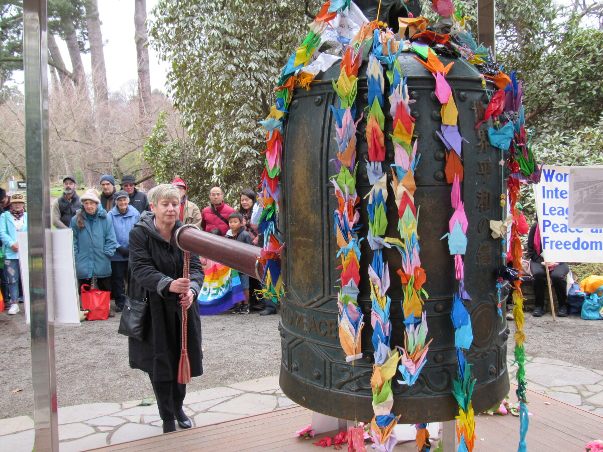 Christchurch Mayor Lianne Dalziel rings the World Peace Bell at the 2018 Hiroshima and Nagasaki Commemorations. At the Christchurch Botanic Gardens.