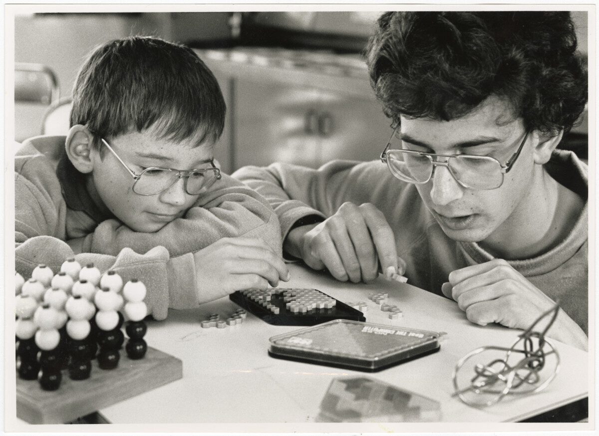 Chris Butcher (left) of Oamaru and Chris Tufley of Christchurch working on maths puzzles at the residential maths Olympiad camp at Rangi Ruru Girls' School. The students are competing for places an at international maths Olympics in China.