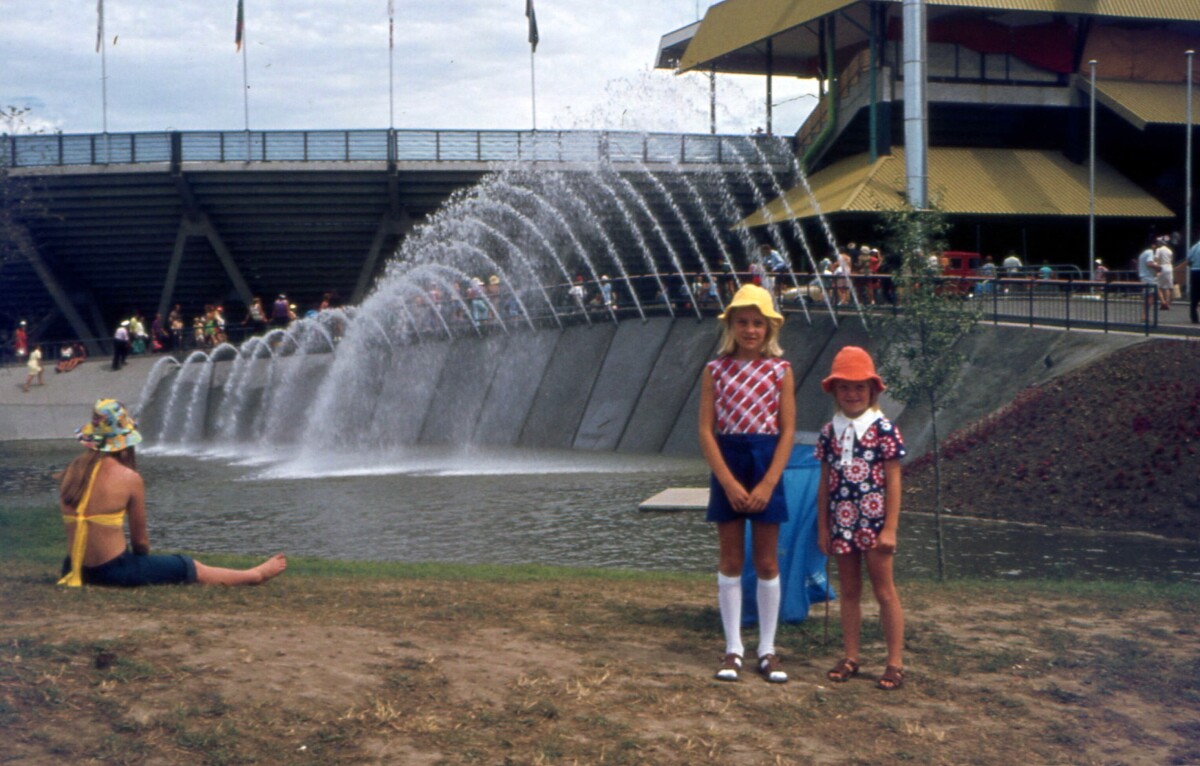 This photo shows my sister (Catherine) and me in our home-sewn Commonwealth Games outfits at QEII Park. This park was purpose-built for the event. It was a really big deal for Christchurch. Our Mum made us special clothes in the colours of the Games. She even bought Commonwealth Games socks which my sister is wearing. They have the logo embossed on the side, which unfortunately you can’t see in this photo, but I remember them oh so well. It is a shame we don’t have towelling hats that match the red/white/blue colour scheme. That would have been another cost that was better spent on some tickets to attend some events. Mum handled the finances in our family and she always set money aside in a tin, called the Fun Tin. So, in this instance we got to go to the opening of the Commonwealth Games in our ‘special’ Games outfits.