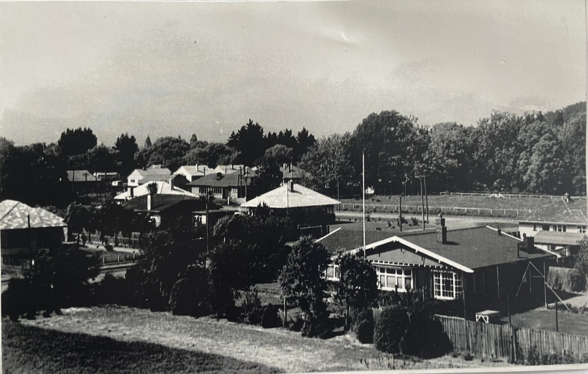 I lived in this house from age of 6 months, until I left to get married in 1953, aged 25. Beginning of our grass tennis court on right. In front of picture, some cultivated land, probably got vegetables growing. The next dark patch would be lucerne, grazing for cows (5 Chilcombe Street).