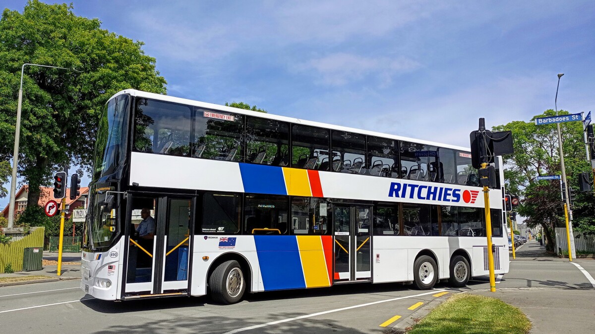 Double-Decker bus strolling its way around the streets of Christchurch.