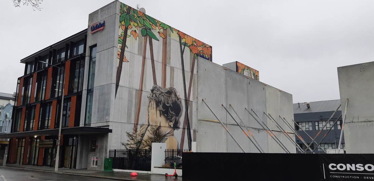 Construction work starting in front of "Hide and Seek" by Wongi "Freak" Wilson on the Manchester Street side of the Unimed Building at 169 Gloucester Street. Taken from Gloucester Street near the intersection with Manchester Street. This shows the temporary nature of street art in the city as new buildings and developments are created.