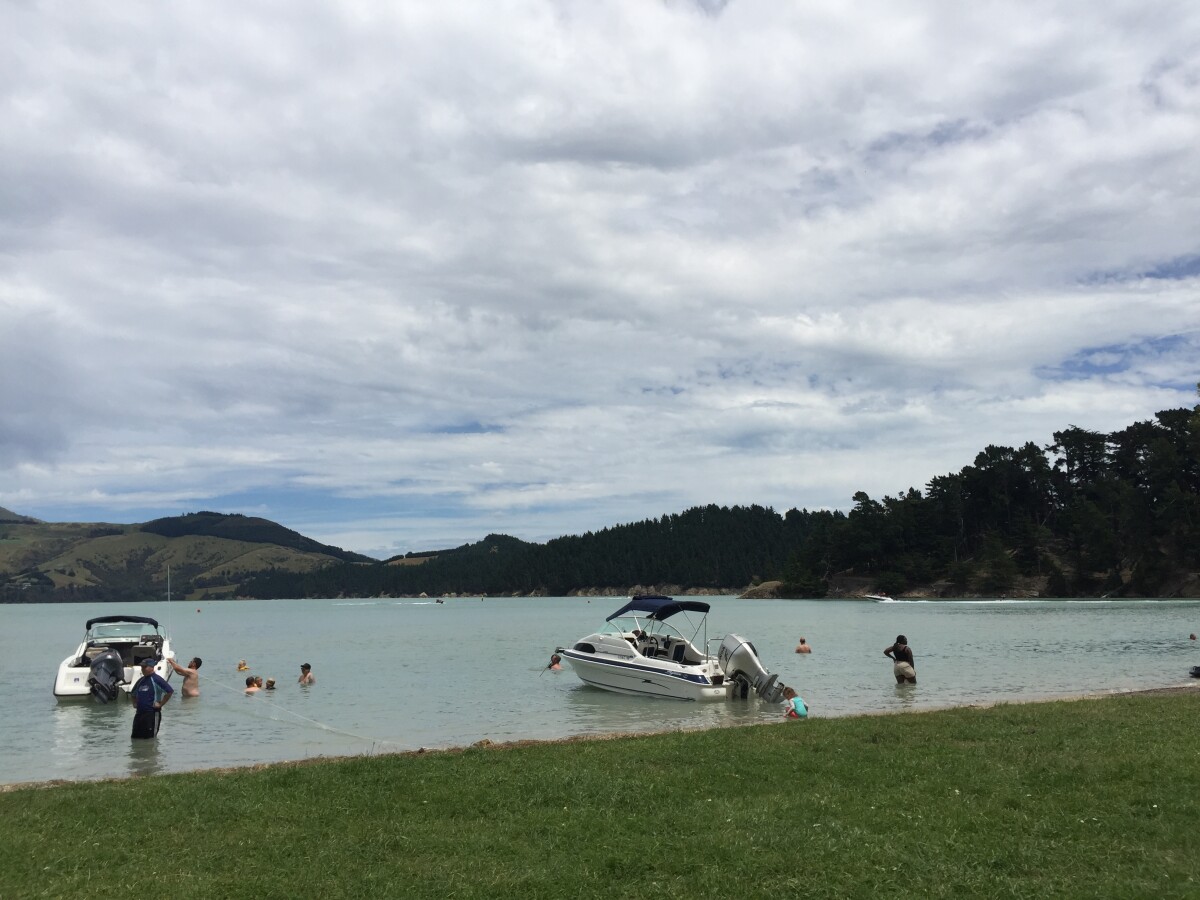 People swimming beside boats anchored near the shore of Quail Island.