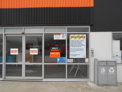 Covid 19 signage at the entrance to Mitre 10, Ferrymead.