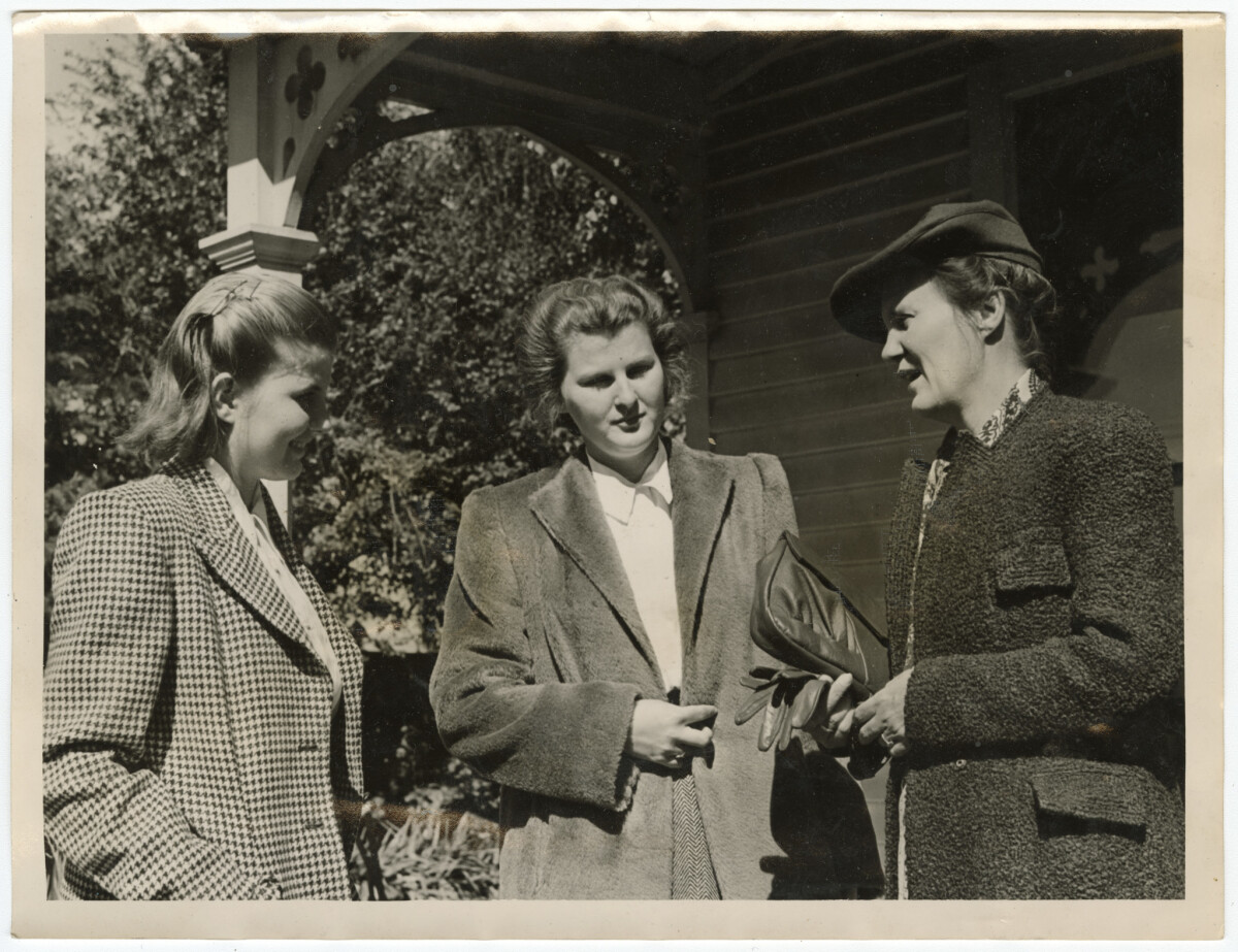 Three Netherlands East Indies evacuee women stood in a group after arriving in Christchurch as part of a temporary scheme during the Second World War.