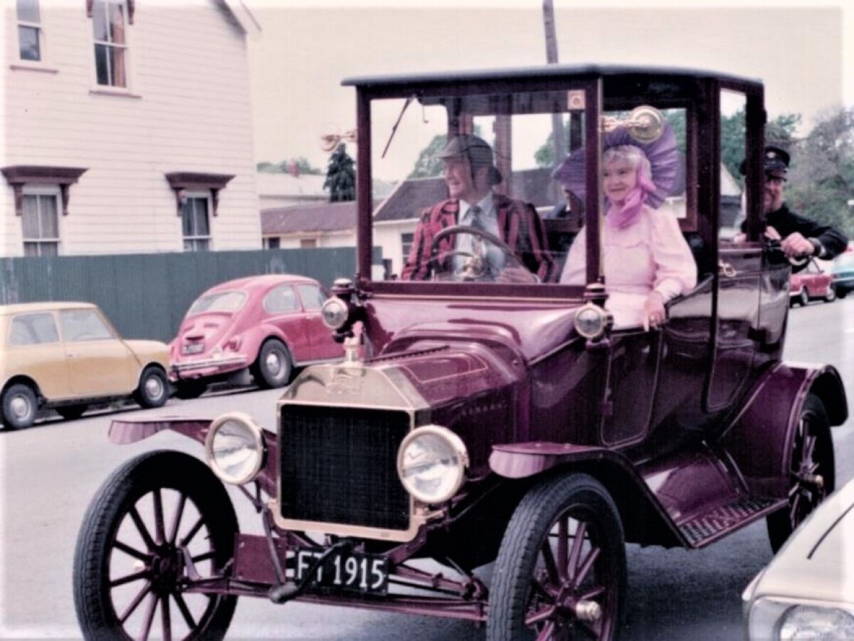 Boat Shed Centennial parade in Park Terrace. Beryl MacLeod is sitting in the front, and Alastair Beissle (from ChCh Theatre Workshop) is at the rear.