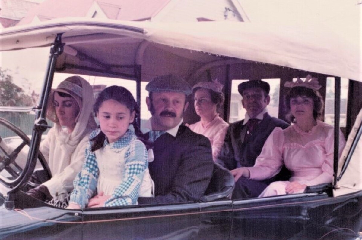 Boat Shed Centennial parade in Park Terrace. Arthur Taylor (from ChCh Theatre Workshop) in front passenger seat. At rear, all from ChCh Theatre Workshop: from left: Rita Taylor, Andy Beever and Angela Poole.
