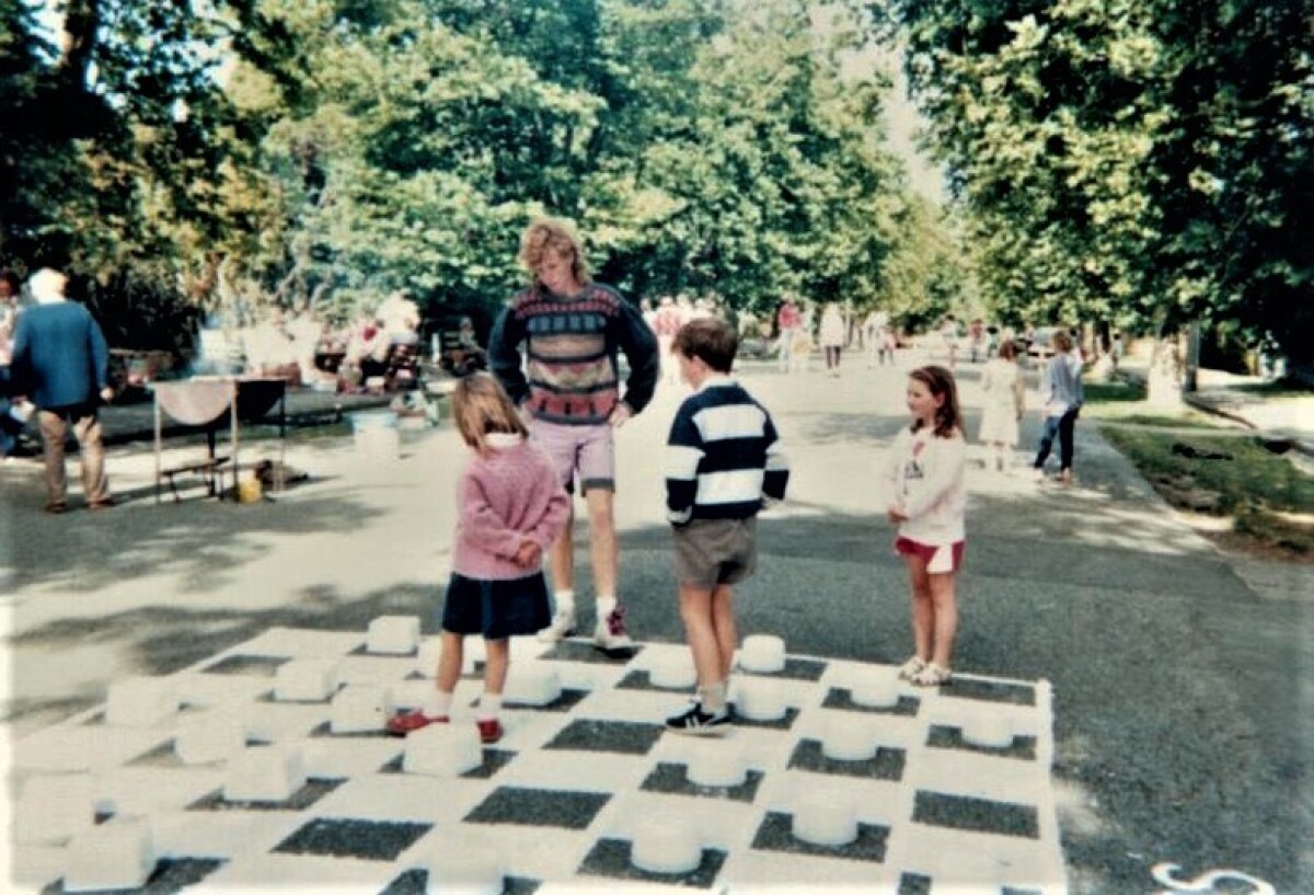 Street party in Fisher Avenue, Beckenham, between Norwood Street and Eastern Terrace. Chess game on the road. Facing the camera is Rhys McLachlan. The younger children are, from left: Davinia Nuttridge, Kyle Hunter (?) and Yvette Absalom on the right in shorts. In the left background is Fred Senter and his barbecue.