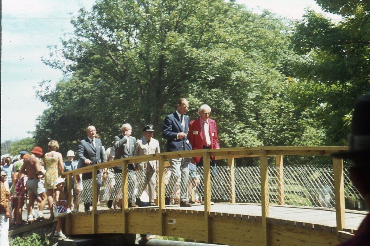 Prince Phillip on the footbridge across the Heathcote River (Between Barrington Street and Valley Road), while attending the Road Race at the Commonwealth Games..