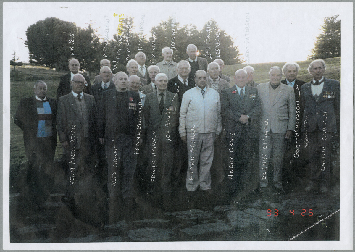 People at 19th Memorial. People pictured are: Back row (L to R): Phil Best, Dick Barlow, Tony Everis, Dave Gibson, Jock McPhail and Les Word. Middle row (L to R): Roy Clements, Frank England, P. Kindlay, Joe Briggs, Des Tomkies, Clem Paterson and Geoff Henderson. Front row (L to R): Unknown, Vern Anderson, Alex Grant, Frank Harvey, Frank Archer, Harry Davis, Barney Divehall and Lachie Griffen.