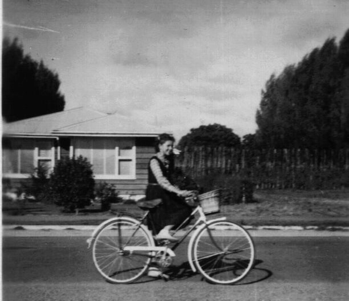 Irene Watts and her first bike, Photo taken from 10-12 Middlepark Road, Upper Riccarton, looking directly (behind Irene) at the empty section that was later to become Gladson Avenue. Behind that section and the row of topped poplar trees were raspberry fields (Gilman's?), where many local children earned summer pocket money by picking the raspberries. (And some sneaked in after work and before dark to eat a handful or two.) The house in the photo belonged to the McNaughton family.