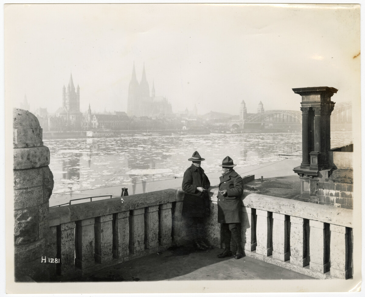 Two soldiers stood along the banks of the Rhine with Cologne city skyline in the background.