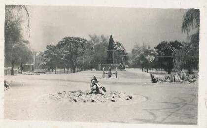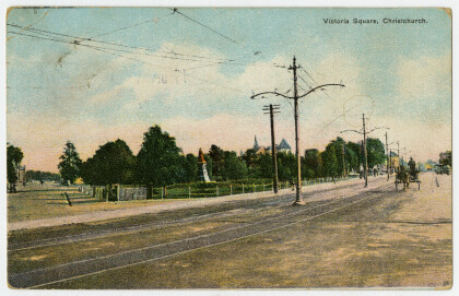 Shows Victoria Square and statue of Queen Victoria. Tramlines ...