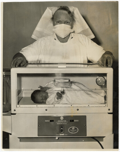 Nurse, Brigadier Drummond with the new incubator with a newborn ...