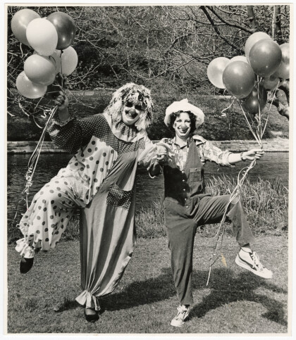 Mary Lamare and Helen Butler dressed as clowns holding balloons ...