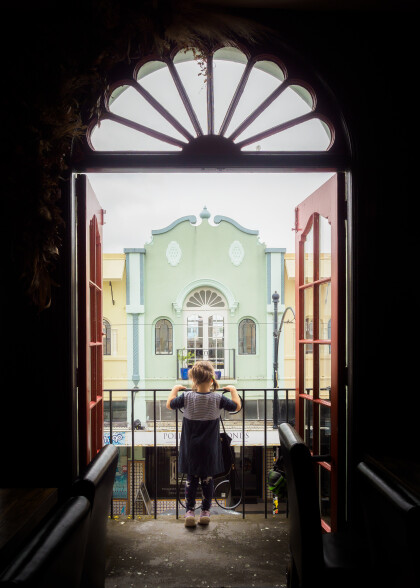 A girl looks out over the balcony of a cafe in New Regent Street ...