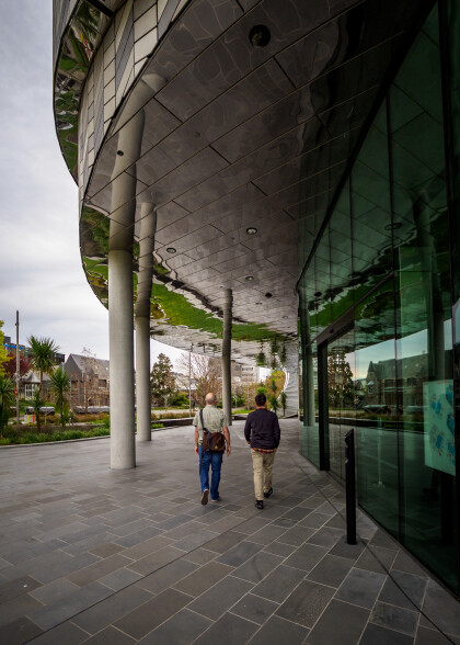 Passers by outside Te Pae