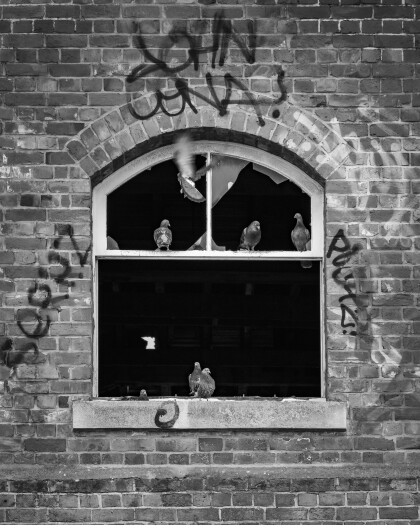 Pigeons roosting in the abandoned building on 167 Hereford Street
