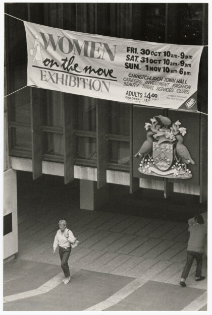 Banner for Women on the Move exhibition outside the town hall.