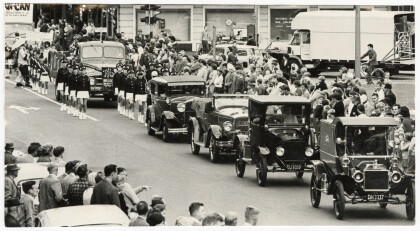 View down Colombo Street of a procession of vintage cars and ...