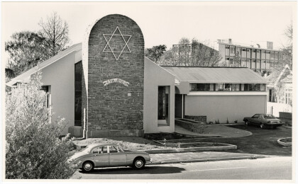 Exterior of the Durham Street Synagogue with a car passing along ...