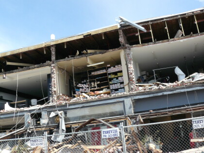 Earthquake damage to shopfronts, including Quinns, at Merivale.