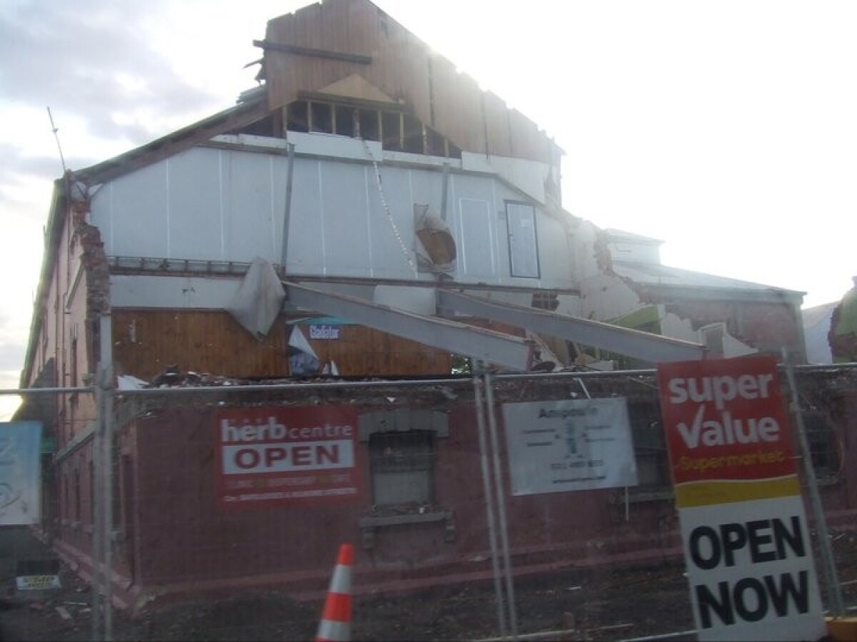 Earthquake damage to an unidentified building, possibly on Kilmore Street. Temporary fencing displays The Herb Centre and Super Value signs.