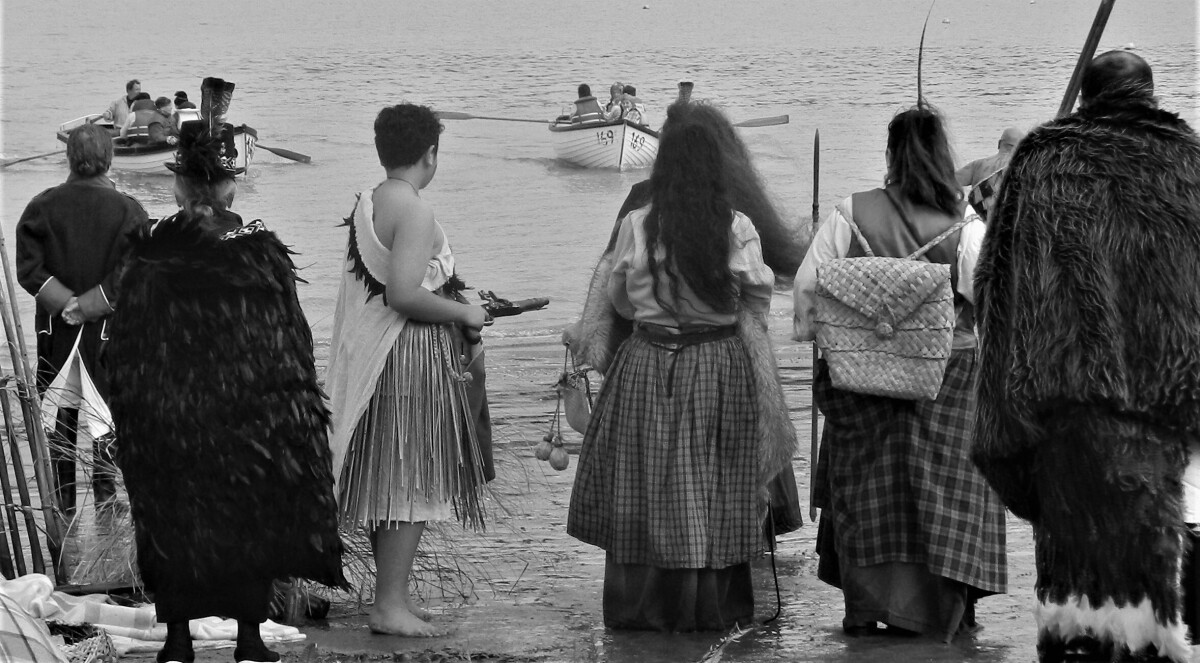 Akaroa French Festival, 2019. Re-enactment of arrival of the English and French. Note the life jackets, a modern health and safety requirement!