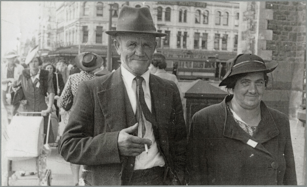 These are my parents: James and Ellen Gifkins, taken outside the Cathedral and the Commerical Insurance Company. You can also see the tram in the background.