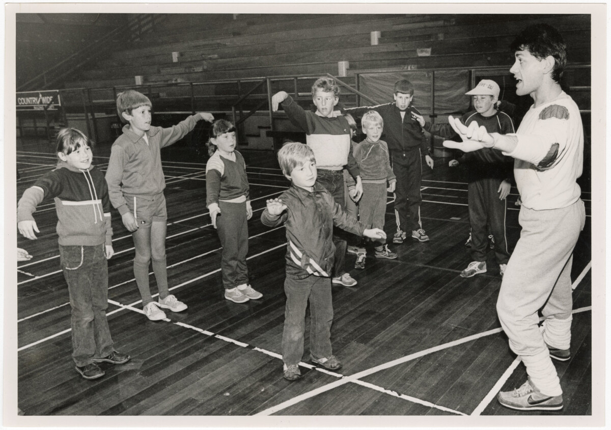 Children participating in a breakdancing class at Cowles Stadium, led by Christchurch City Council recreation officer, Neil Gudsell, for a school holiday programme. Children include Ben Lucas (foreground above) and Steven Atkins (Foreground below).