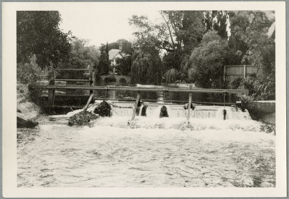 The Flemings Mill weir on the Avon River. Mona Vale can be seen in the background.
