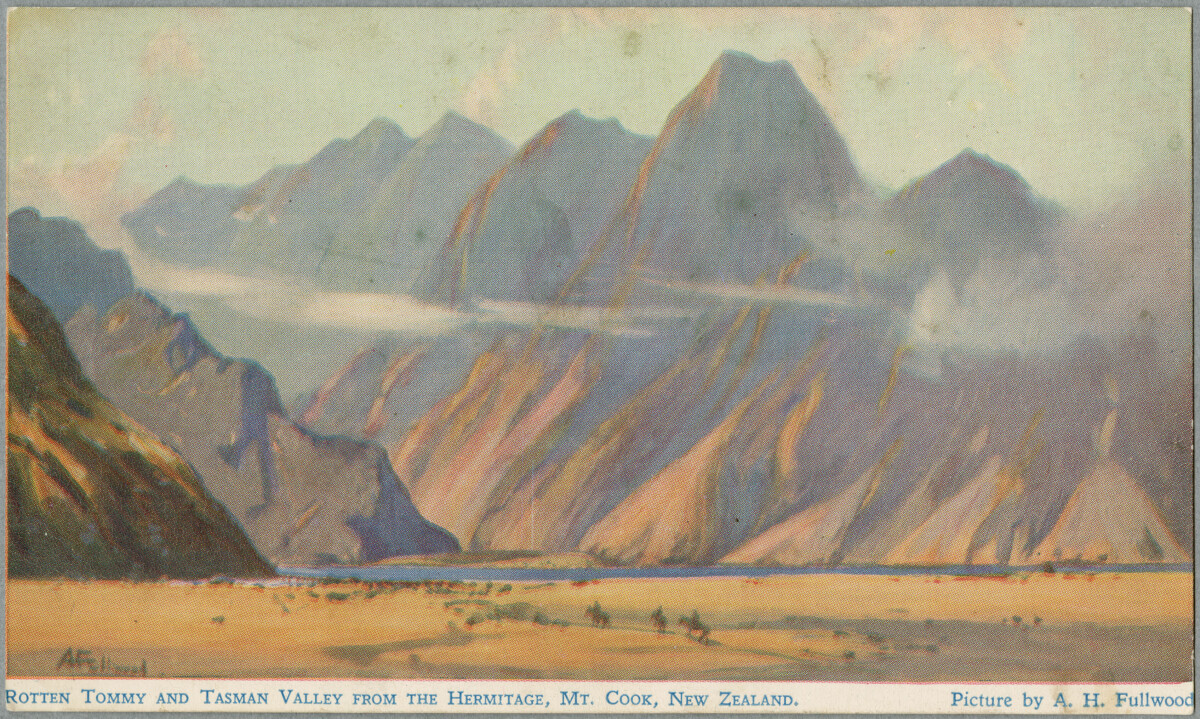 Rotten Tommy and Tasman Valley from the Hermitage, Mt Cook.His paintings of New Zealand scenes from the 1880s and 1890s were reproduced by Raphael Tuck & Sons as `Oilette' postcards, Wellington, NZ, possibly around 1905.A. H. Fullwood's paintings of New Zealand scenes from the 1880s and 1890s were reproduced by Raphael Tuck & Sons as `Oilette' postcards, Wellington, NZ, possibly around 1905.