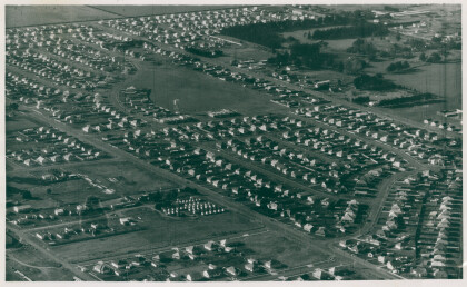 Aerial view of new housing area at Hornby. A shopping area, with ...