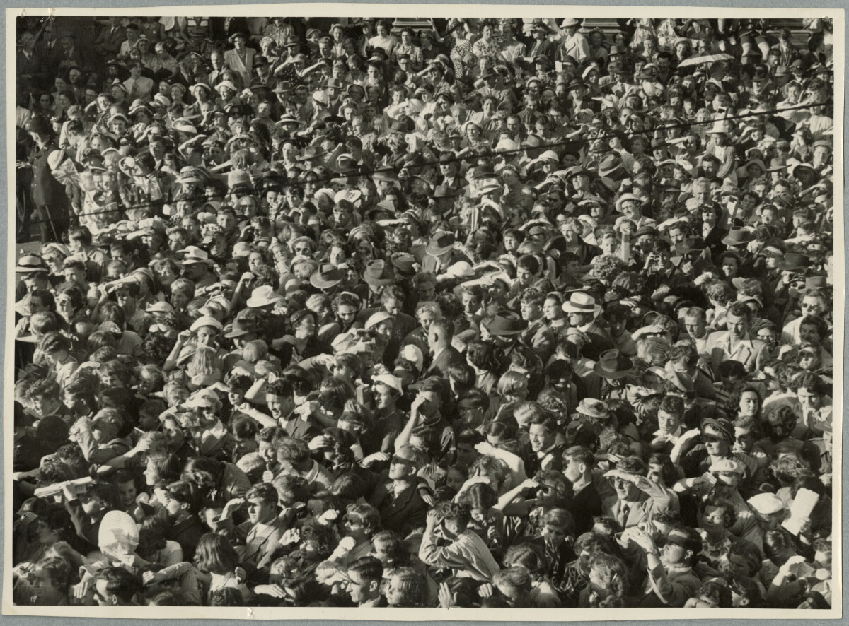 Photographs taken by my late father Pete Basire of the first visit of a Reigning Monarch, Queen Elizabeth II and the Duke of Edinburgh, to New Zealand, Christchurch 18 -22 January 1954. Close up of the crowds enthusiastically greeting Queen Elizabeth, perhaps taken during one of the Queen several appearances from the balcony of Clarendon Hotel.