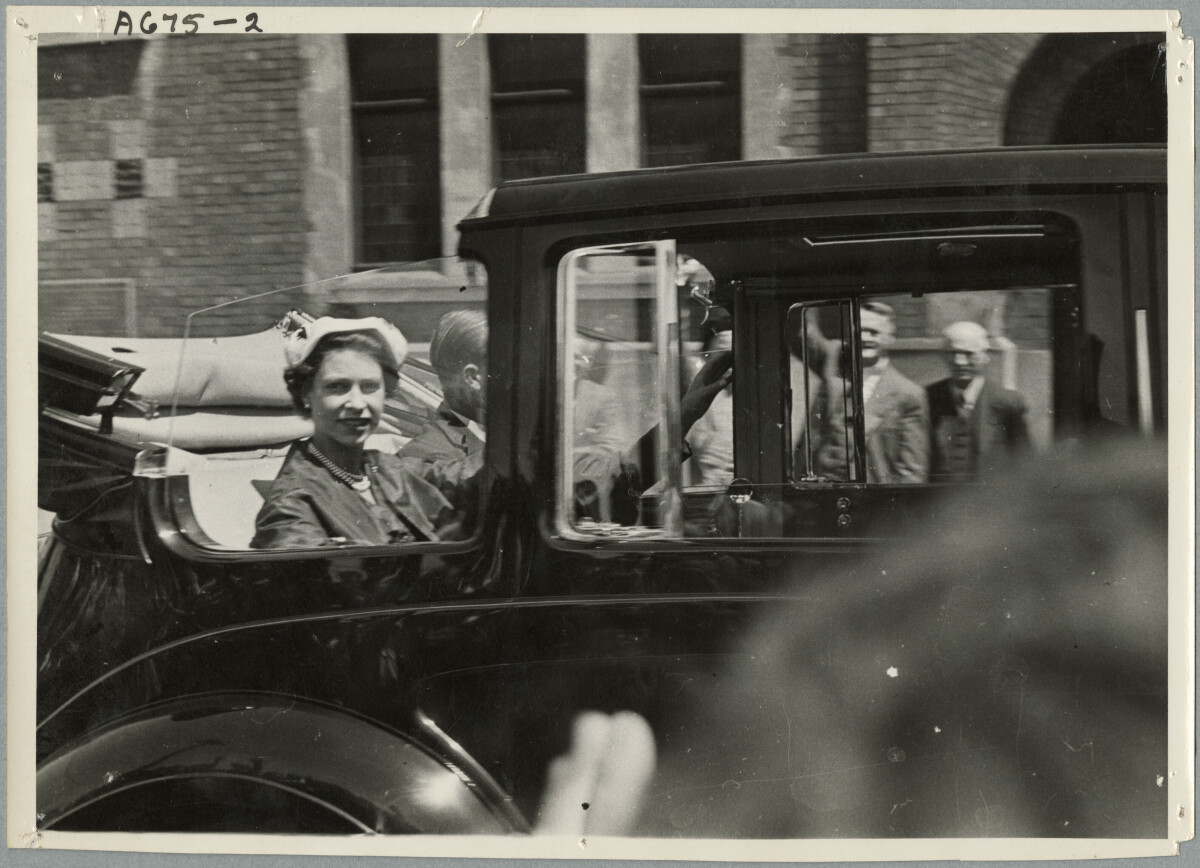 Photographs taken by my late father Pete Basire of the first visit by a Reigning British Monarch, Queen Elizabeth II and the Duke of Edinburgh, to New Zealand, Christchurch 18 -22 January 1954. Photo taken of the Royal Couple greeting crowds, on route to one of their many official engagements, historic building in the background may be the University of Canterbury now the Arts Centre, or the museum.