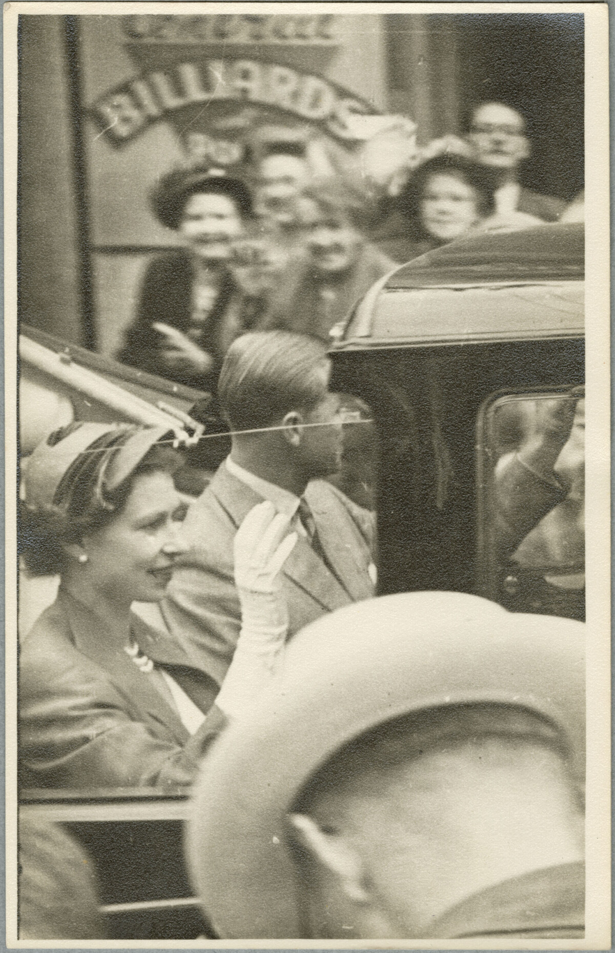 Photographs taken by my late father Pete Basire of the first visit by a Reigning British Monarch, Queen Elizabeth II and the Duke of Edinburgh, to New Zealand, Christchurch 18 -22 January 1954. Photo taken of the Royal couple on route to one of their many engagements, waving to an enthusiastic crowd, Billiards sign in the background.